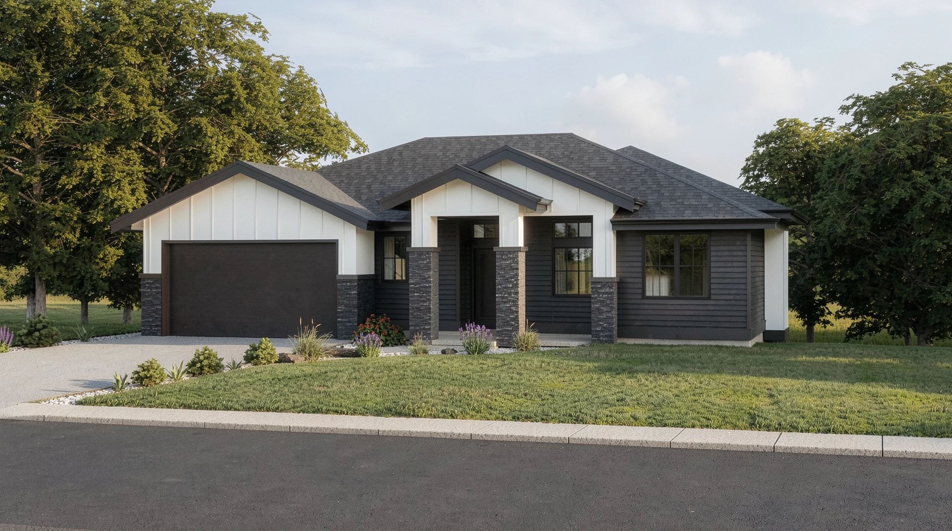 Gables lend charm to this attractive two-bedroom home, which offers a young family room to grow, thanks to the unfinished basement included in the plans. The covered entry, always welcome in wet weather, leads directly into the great room. Access to a spacious covered deck will encourage outdoor living during the warmer months, while the gas fireplace will make this room a favourite wintertime retreat. Thanks to the open-plan design, the great room flows into the dining room, creating an ideal space for entertaining as well as for family activities. Light will flood through the deep dining-room windows, adding to the area’s spacious feeling. The kitchen is separated from the dining room and great room by an island. This will provide a popular place for family and visitors alike to perch, preventing the cook from feeling isolated. A large corner pantry offers extra storage space. The primary suite over looks the back garden, and a window over the soaker tub adds a touch of spa-like luxury to the ensuite. Double basins will ease the morning rush-hour. The walk-in closet features built-in shelves along three sides and offers enough space for even the most fashion-conscious occupants. The second bedroom includes a deep window that looks onto the front garden. A three-piece bathroom is located close by, as well as a linen cupboard. To the left of the foyer is the laundry room, with access to the double garage as well as shelving for family gear. A coat closet for guests is situated near the foyer. Ceilings measure ten feet throughout. Exterior finishes include white vertical board and batten, painted trim and decorative stone accents. This home measures 51 feed wide by 49 feet deep, for a total of 1,514 square feet of living space on the main floor.