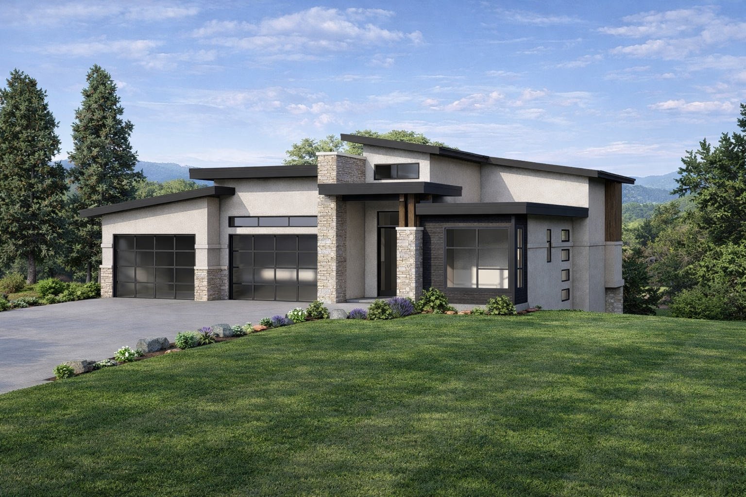 This bold, modern rancher offers 1,767 sq. ft. of single-level living with a flexible layout designed for sloped lots and future basement expansion.
