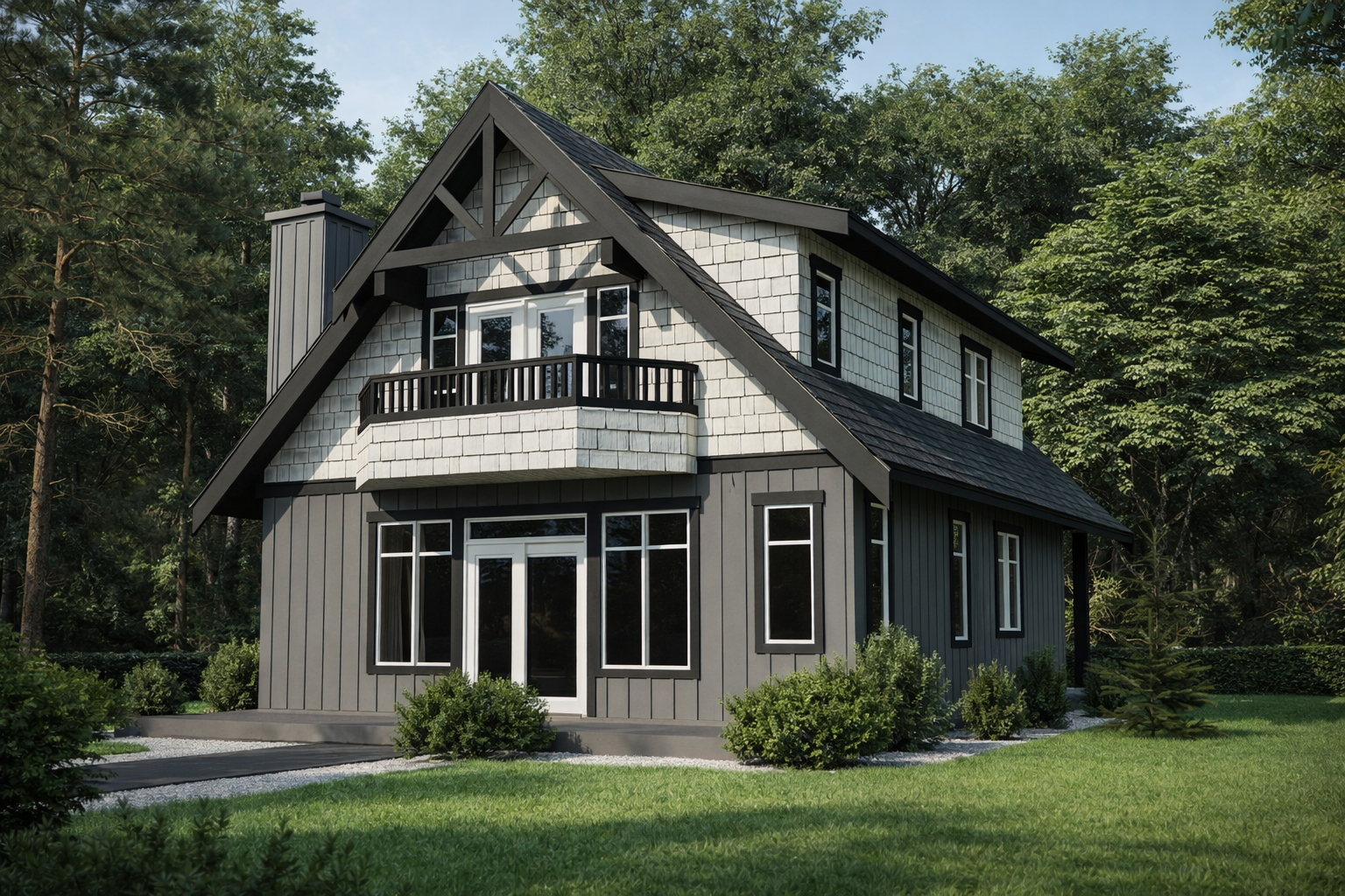 Exterior finishes include wood shingles on the upper part of the cottage facade, with vertical siding on the lower part and chimney, as well as on the sides of the upper story. Painted trim contrasts with the facade, comprising two pale shades. The doorway to the sundeck is trimmed in white.