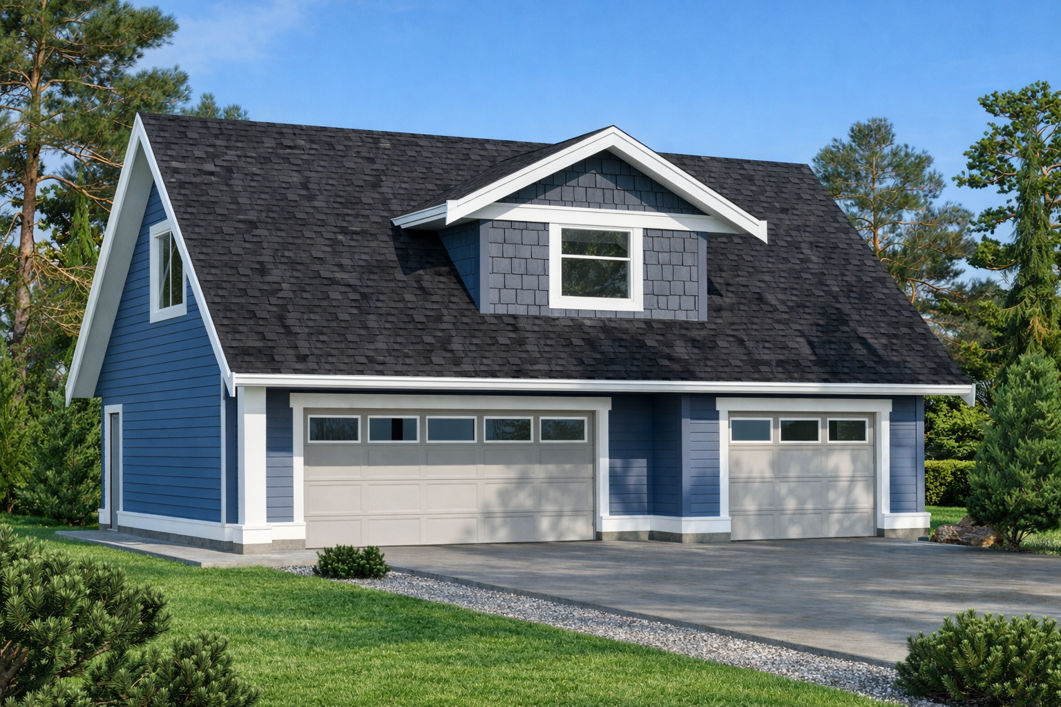 Exterior finishes include shingles around the dormer window and in the gable, as well as horizontal wood siding and painted trim. Decorative garage doors lend the structure a finished look.