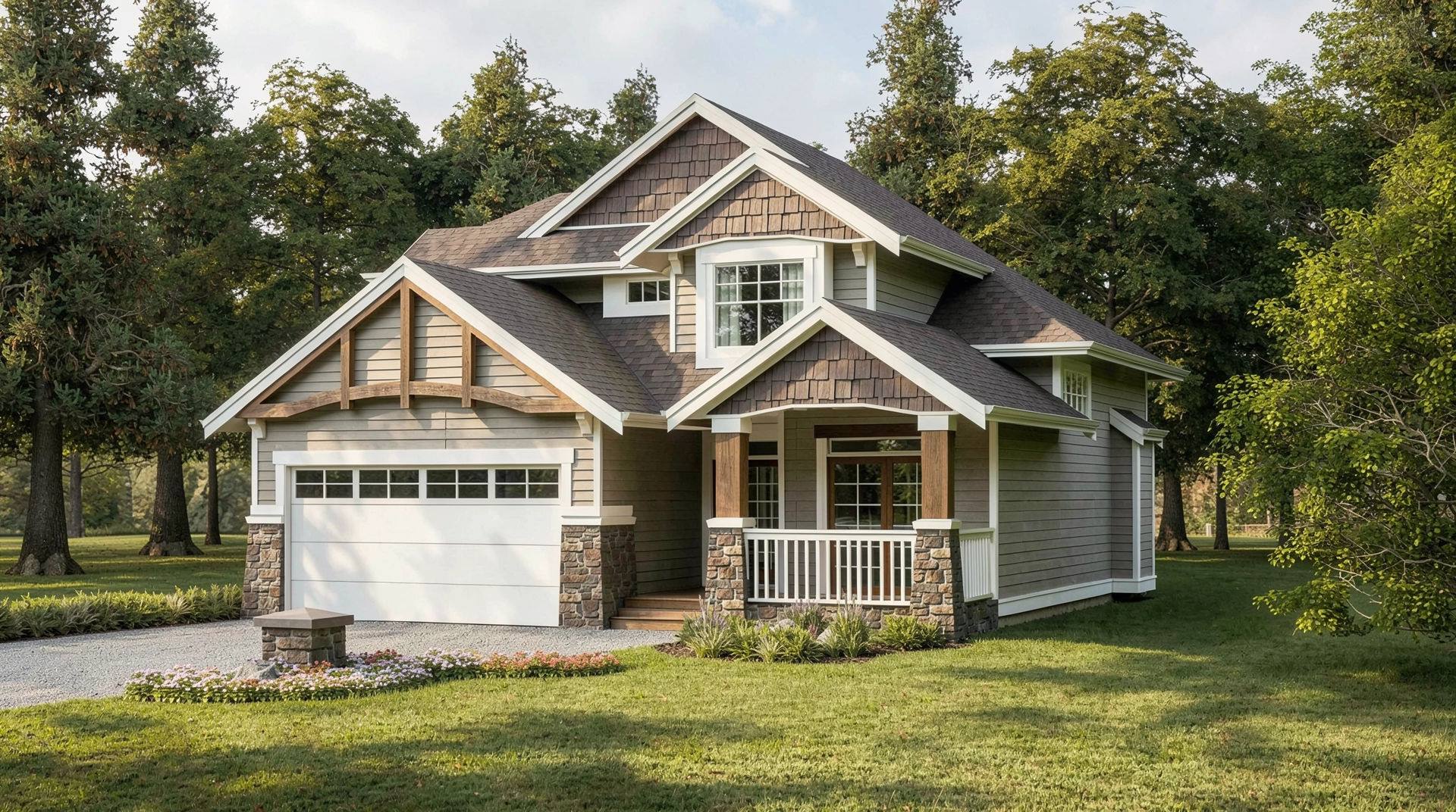 Gables always make a house seem extra homey, and this multi-gabled three-bedroom family residence is no exception. In addition, the cross-bracing above the garage door, the deep eaves and the mullioned windows evoke the ever-popular Arts and Craft style. Entry is up a couple of steps into a roomy foyer. A coat closet is located nearby, across from a powder room. Immediately to the right of the foyer is a den, featuring French doors to a covered porch. Through an archway is the great room, with a dramatic double-height ceiling and a fireplace. The dining room, open to the great room, occupies a bayed-out area and enjoys access to a spacious terrace — the perfect spot for al fresco summer meals. The kitchen is separated from the dining room by a prep island, so the cook will never feel isolated. The sink, set diagonally into a corner, will receive lots of light from windows on two sides. A walk-through pantry connects the kitchen to the laundry room. With a useful coat cupboard, as well as access to the double garage, the laundry room can double as a mud room. A U-shaped flight of stairs leads to the second floor, a portion of which is open to the great room below. The master suite features a large window that overlooks the back garden. The walk-in closet, roomy enough for any fashionista, is separated from the four-piece ensuite by a handy linen cupboard. A shower stall and soaker tub in the en-suite add a touch of spa-like comfort. The second and third bedrooms, separated by a three-piece bathroom, both enjoy an extra-wide window sill. Ceilings measure nine feet throughout. The double garage is large enough to contain a compact workshop. Exterior finishes include painted trim and wood siding, and the wooden pilasters that frame the front porch have stone bases. This home measures 38 feet wide and 54 feet deep, for a total of 1,997 square feet of living space.